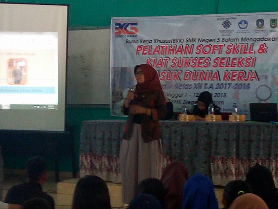 Pada Tanggal 7-12 April 2018 SMK Negeri 5 Batam mengadakan acara dengan tema”Pelatihan soft skill dan kiat sukses seleksi mencari kerja”. Pelatihan ini dibuka oleh Bapak Kepala Sekolah SMK Negeri 5 Batam yaitu Bapak Agus Sahrir, M.Pd dan dilanjutkan oleh Ketua Pelaksana ibu Noviarti, S. Pd dan sekaligus sebagai ketua Bursa Kerja Khusus (BKK) SMKN 5 Batam.
