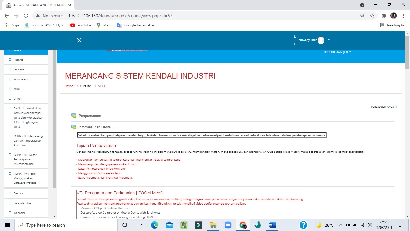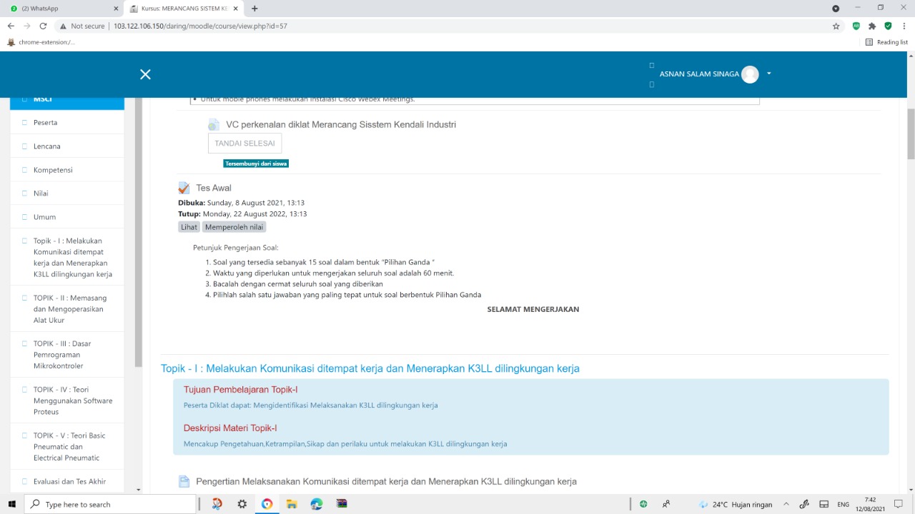 Salah satu guru jurusan Teknik Elektronika Industri diundang setelah sebelumnya mendaftar melalui link pendaftaran untuk mengikuti pelatihan yang diselenggarakan oleh P4TK Medan tersebut. Diklat yang diikuti yaitu Diklat Merancang Sistem Kendali Industri dengan materi yaitu K3, Penggunaan Alat Ukur, Mikrokontroller, PLC dan Pneumatik. Pelatihan ini sebelum dilaksanakan maka terlebih dahulu melaksanakan pretest yang diikuti oleh 12 peserta pada LMS (learning Management system) dan diakhir diklat daring dilaksanakan postest yang juga diikuti oleh 12 peserta yang terdiri dari berbagai sekolah di wilayah binaan P4TK Medan.